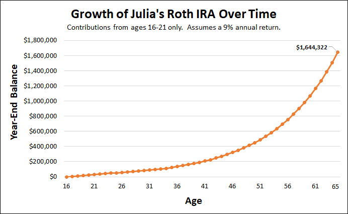 Julia starts working part-time at a grocery store at 16, earning about $6,000 per year. She invests $300 per month into a Roth IRA for two years, contributing a total of $7,200.